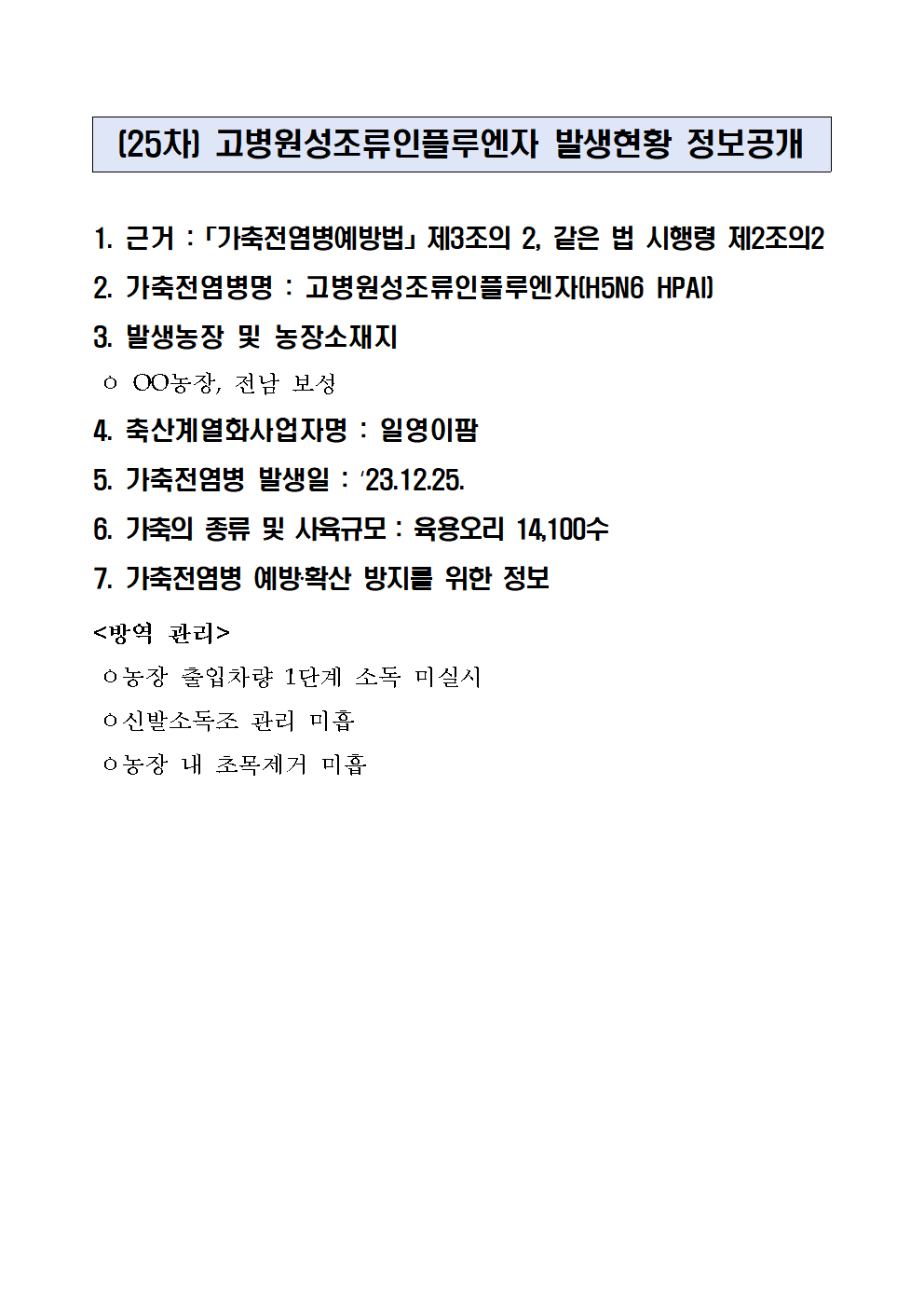 고병원성 조류인플루엔자 발생현황 정보공개('23.12.25.)