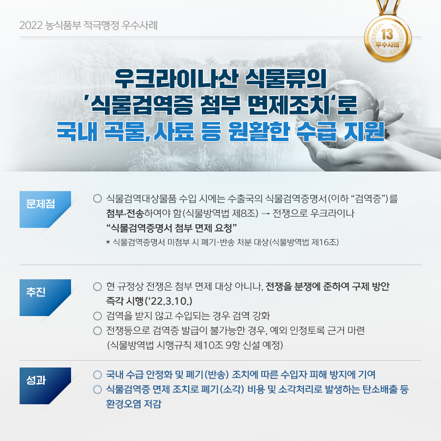 농림축산식품부 이(가) 창작한 [적극행정 우수사례]'식물 검역증 면제'조치로 국내 곡물, 사료 등 원활한 수급 지원 저작물은 "공공누리" 출처표시 조건에 따라 이용 할 수 있습니다.