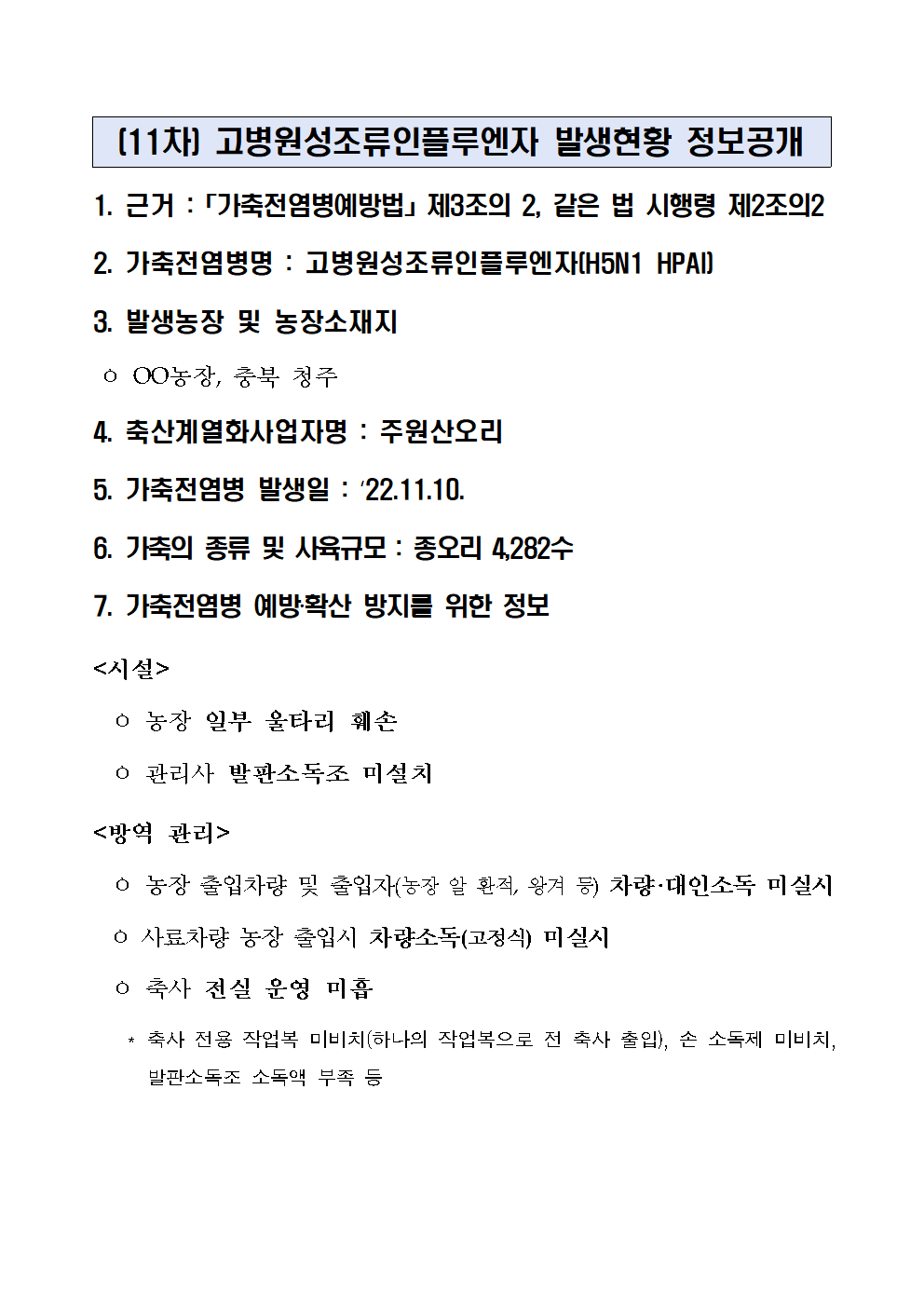 고병원성 조류인플루엔자 발생현황 정보공개('22.11.10.)