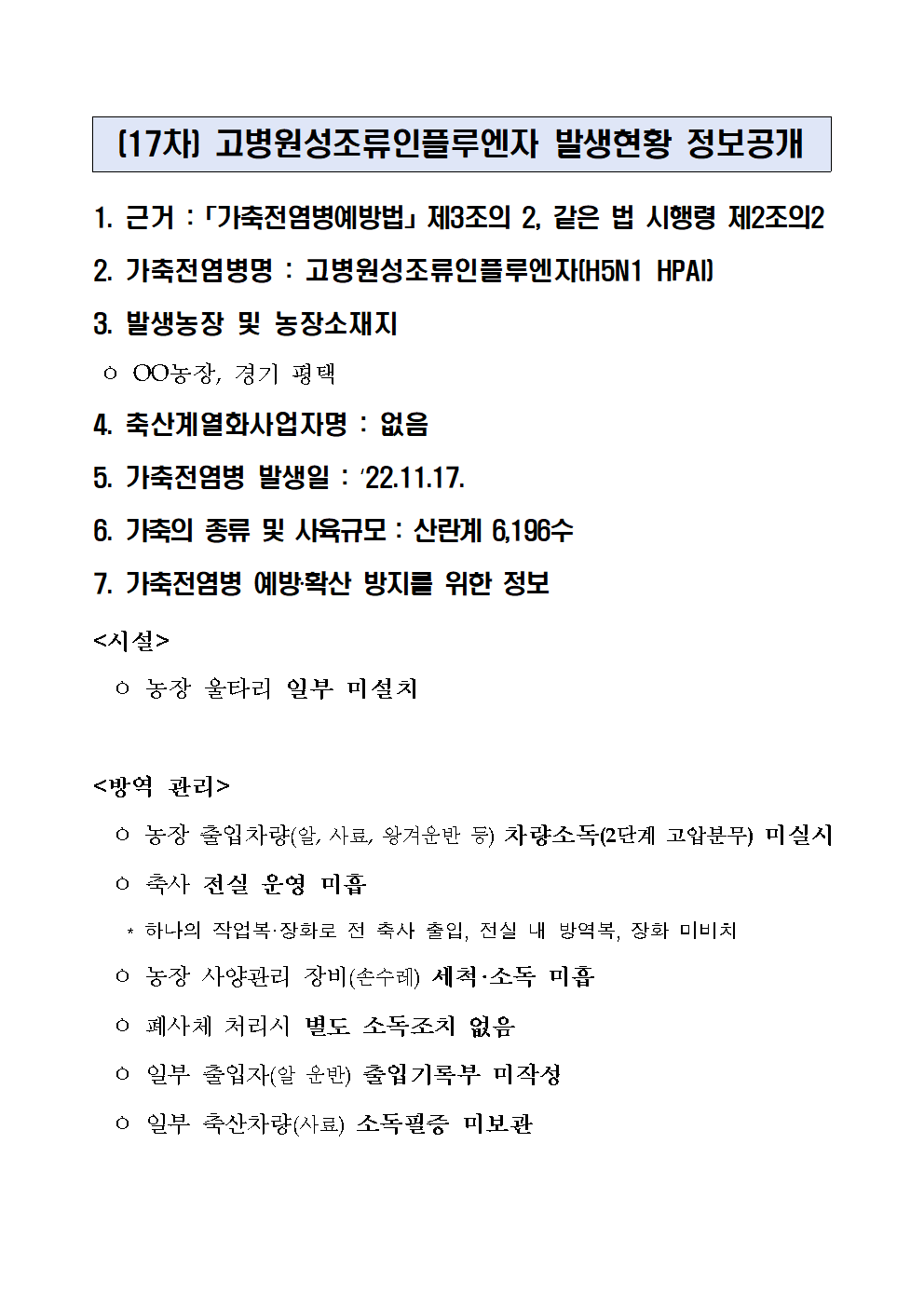 17차 H5N1 HPAI 발생현황 및 미흡사항 정보공개.hwpx