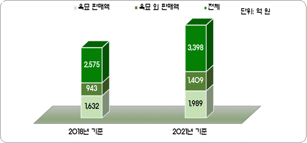 ○ 육묘 이외 판매액(농산물 판매) 등을 합한 업체의 총판매액은 3,398억 원으로 2018년 2,575억 원 대비 32.0% 증가