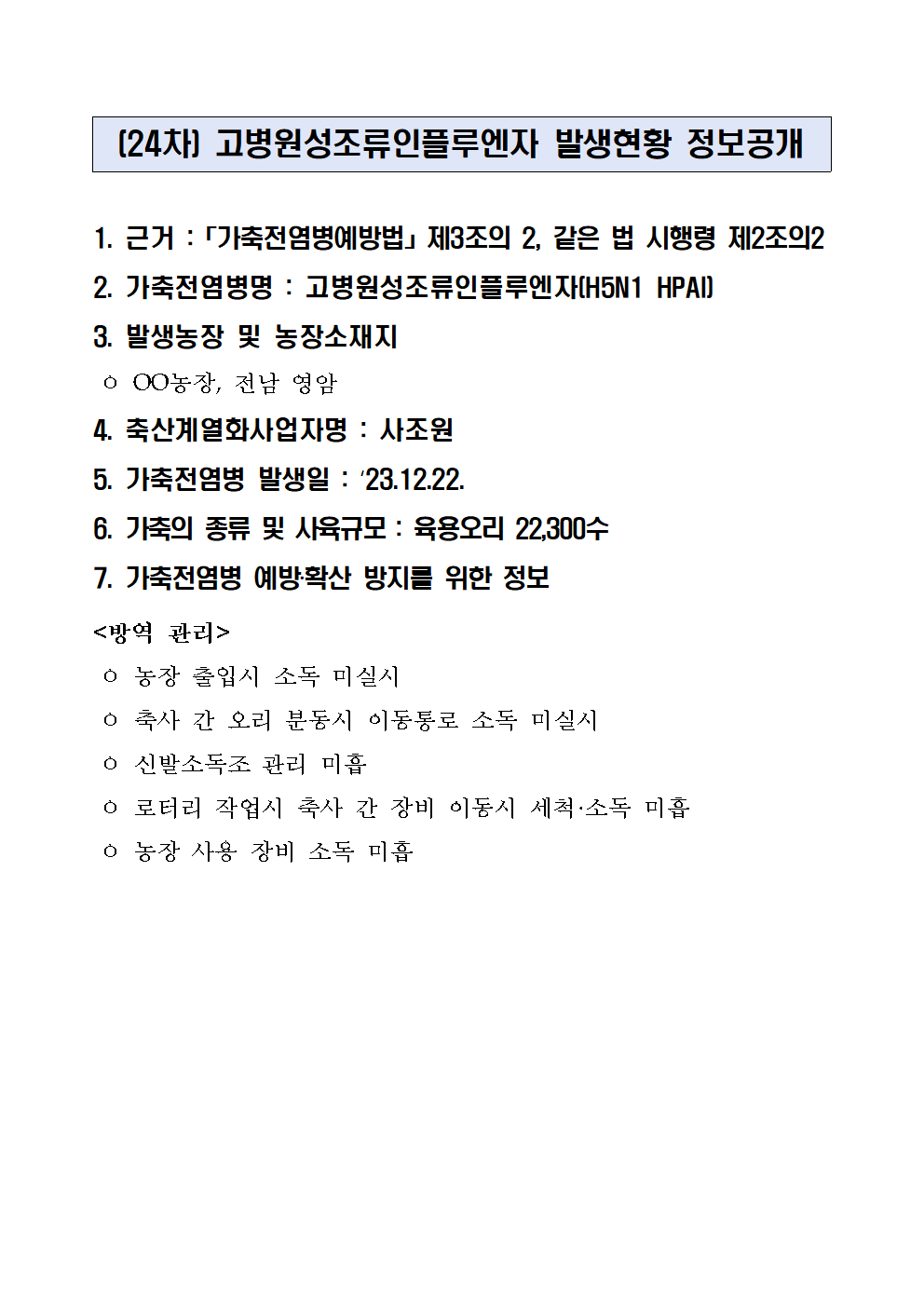 고병원성 조류인플루엔자 발생현황 정보공개('23.12.22.)