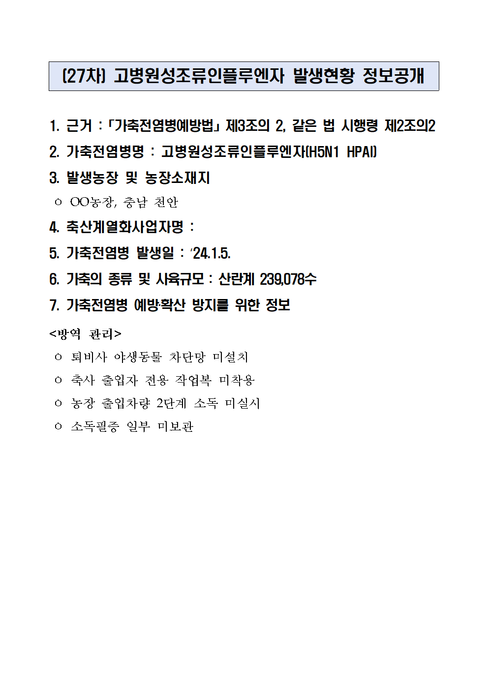 고병원성 조류인플루엔자 발생현황 정보공개('24.1.5.)